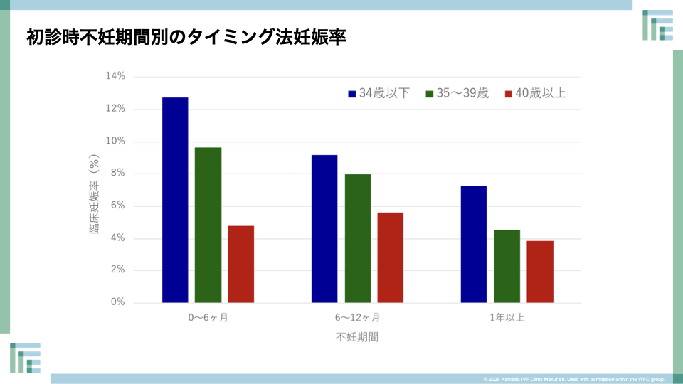 当院での初診来院前の不妊期間で、その後どの程度タイミング妊娠したか出してみました。やはり不妊期間が長いほどクリニックにかかってからもタイミングでの妊娠率が上がらないことがわかります。当然といえば当然ですが、不妊スクリーニングを実施しステップアップすることが必要だと思います。