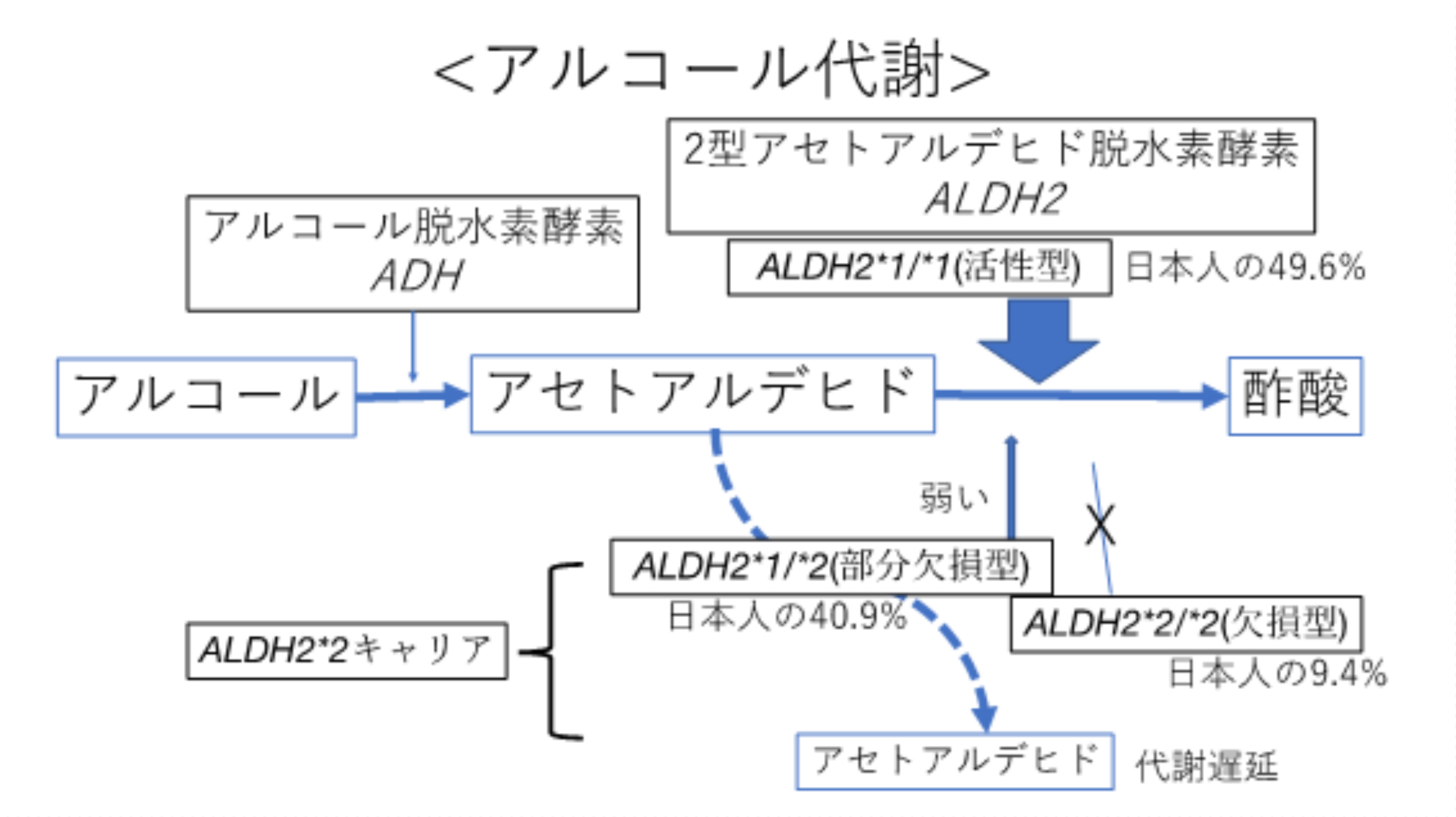 ALDH2には活性型(ALDH2*1)と非活性型(ALDH2*2)の二つの亜型があります。この組み合わせで活性型のALDH2*1/*1と、部分的に低下しているALDH2*2/*1(部分欠損型)、ほとんど活性のないALDH2*2/*2(欠損型)に別れます。日本人のある大規模な研究では、活性型の方が49.6%、部分欠損型が40.9%、欠損型が9.4%でした(文献4)。つまり、日本人の約半数がALDH2*2キャリアでアルコール代謝が低下あるいは欠損していることになります。アルコール代謝にはほかの酵素も関係しますが、ALDH2の欠損型の方はほとんどアルコール摂取の習慣がないとされていますし、ほぼお酒を飲めないと言えます(筆者もこれに相当し、お酒を飲んでも苦しいだけ、全く楽しくありません)。飲める方でもその45%程度がアセトアルデヒドの害を受けることになります。また、一般に東アジア人の40%から50%で活性が低下しているとされています。