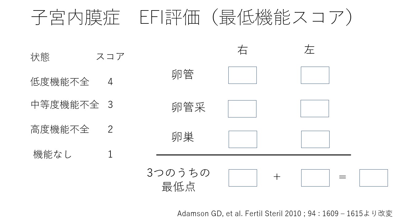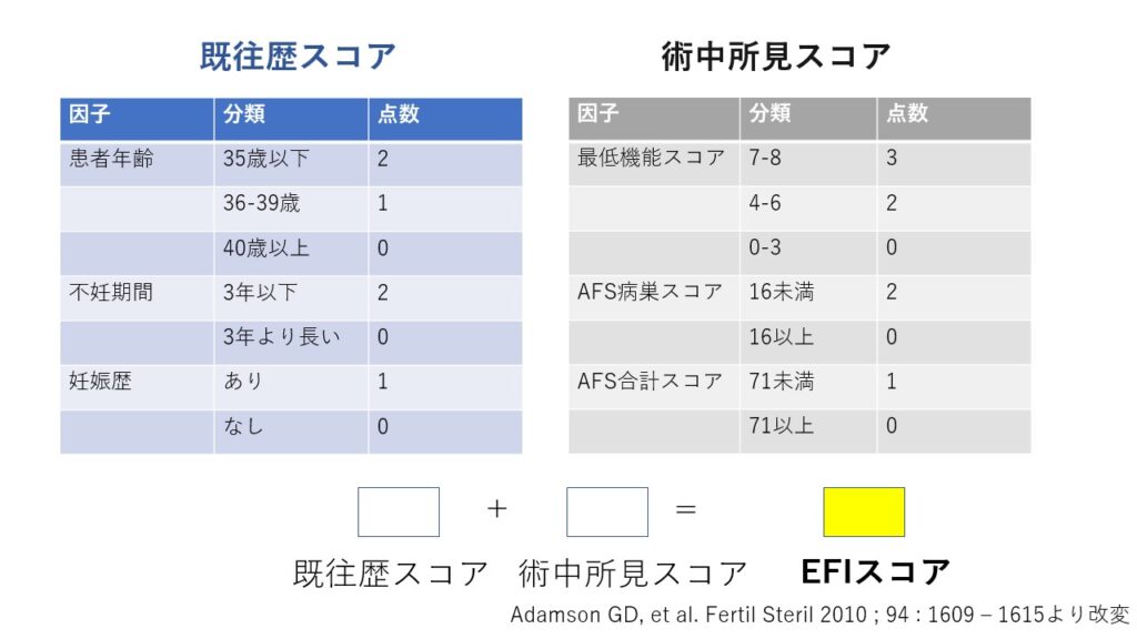 Endometriosis fertility index(EFI)評価はAdamsonらが2010年に提唱した子宮内膜症合併不妊症に対して手術療法を行った患者に対する妊孕性評価方法です。