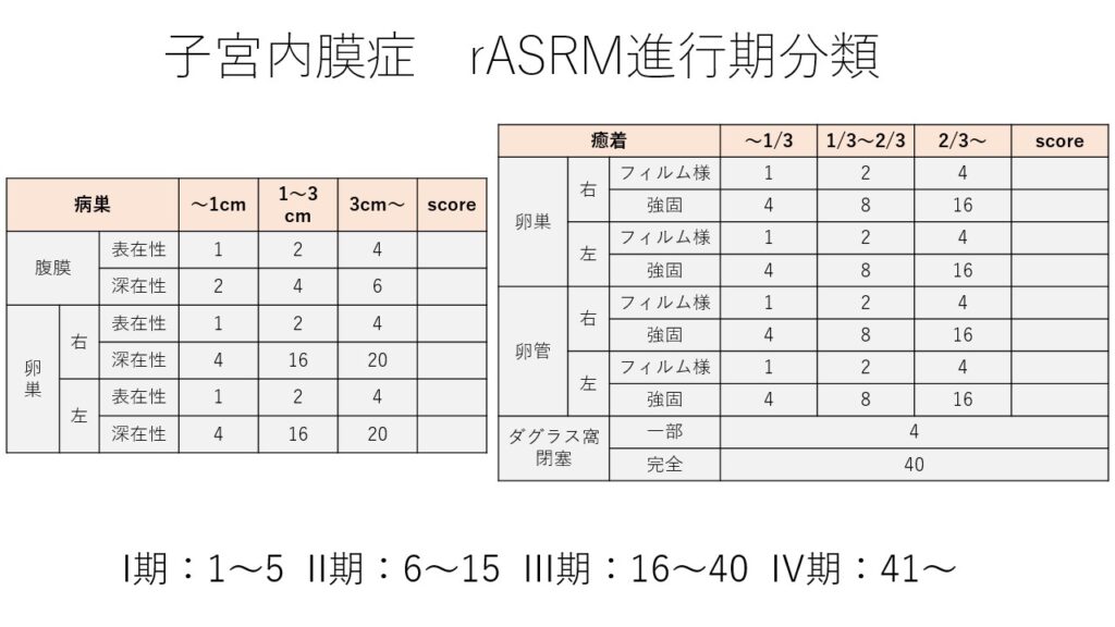 rASRM分類(1996年に改訂)は世界的に最も用いられている子宮内膜症の進行期分類です。深部子宮内膜症や痛みの評価がないことや、当進行期分類と不妊予後が関連しないことなどが指摘されてきてEFIが扱われるようになりました。