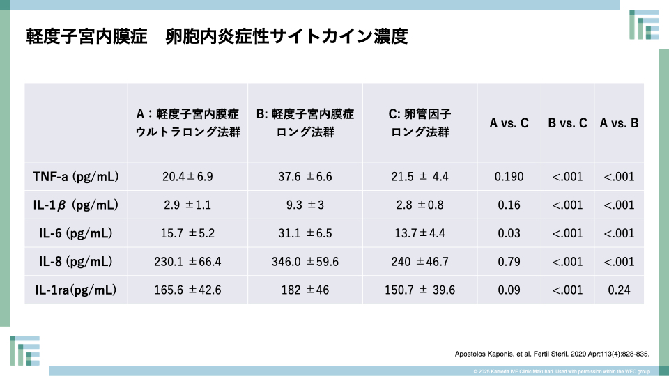 内膜症患者で腹腔鏡を事前に行っている軽度内膜症患者にはウルトラロング法は不要なようです。ただ、内膜症の重症度が高い方、反復不成功である方にはウルトラロング法は卵胞内炎症環境を改善するのは間違いなさそうなので試行する価値があるかもしれません。