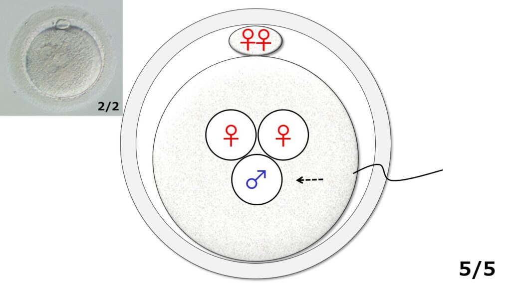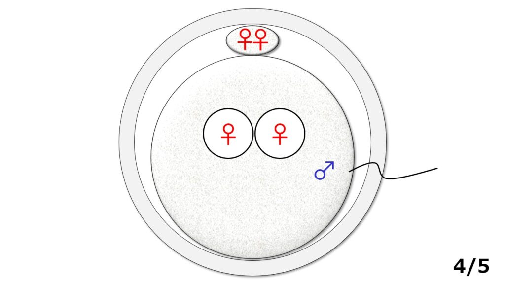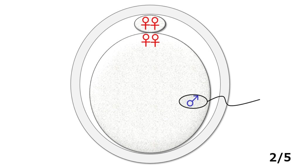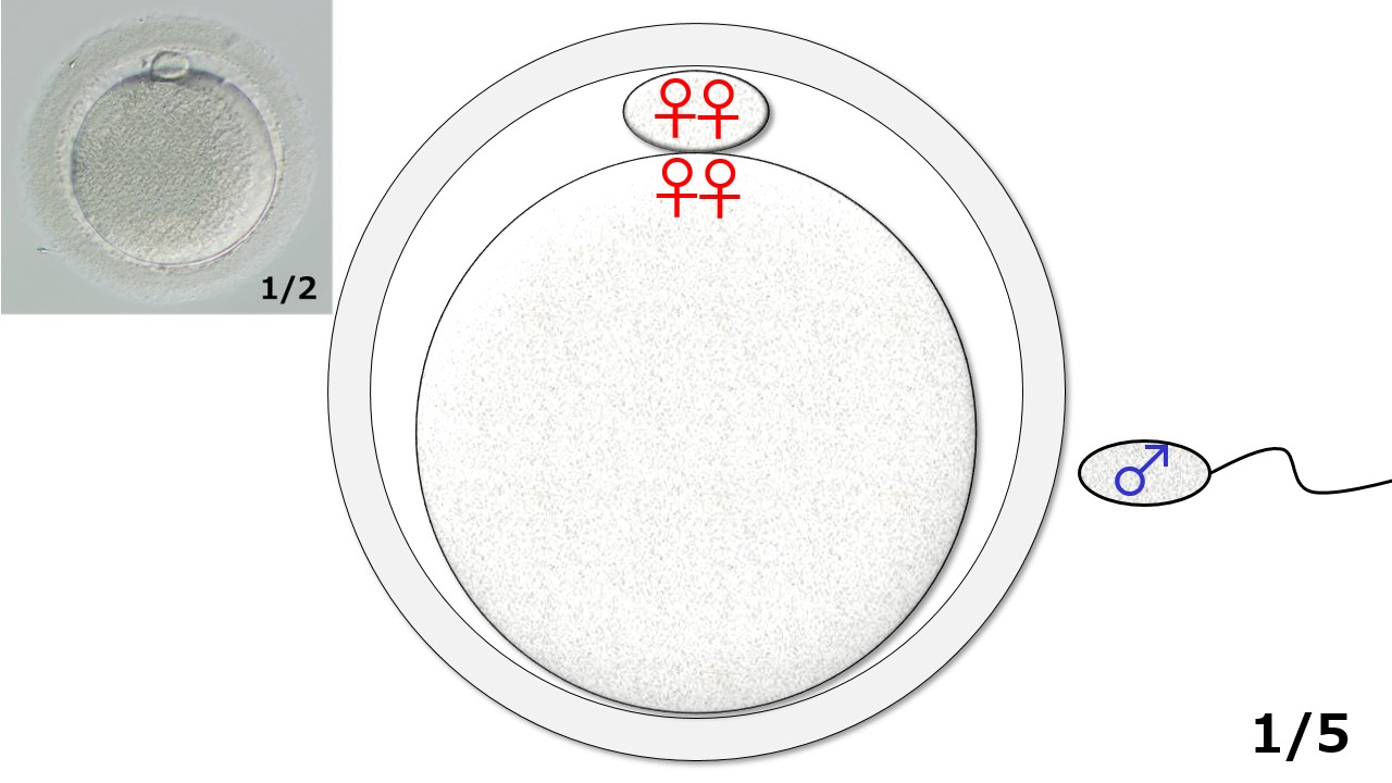 1/5:卵子は受精前の状態です(写真版1/2に相当)。この時、時計方向12時00分のところに1個だけある丸いポチの中には女性の遺伝情報が2個(♀♀)、卵子本体の中にも2個(♀♀)ある状態です。一方、卵子に向かってきている精子の頭の中には男性の遺伝情報が1個(♂)入っています。