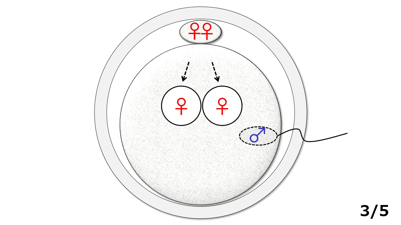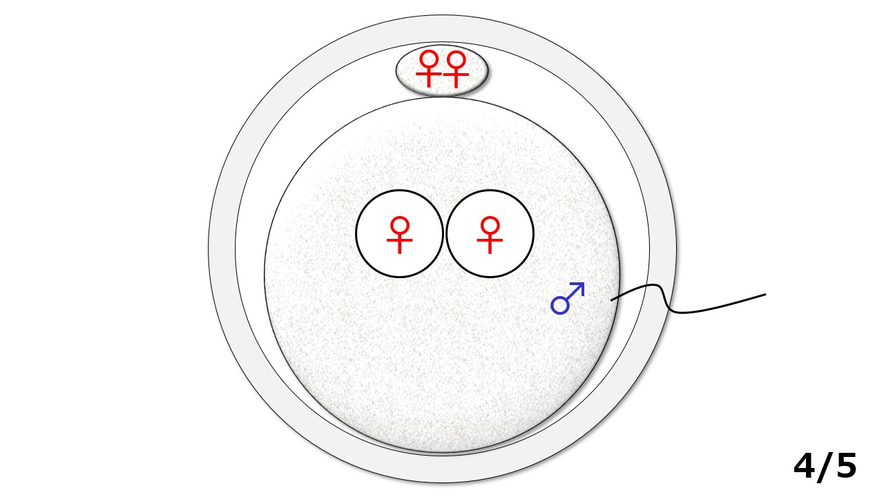 2-3/5:精子の侵入を合図に、通常は卵子の中にある2個の女性遺伝情報のうち1個は外に放り出されるのですが、放り出されず2個共中に残って2個の女性遺伝情報(♀♀)が袋の姿に形を変えて出現します。