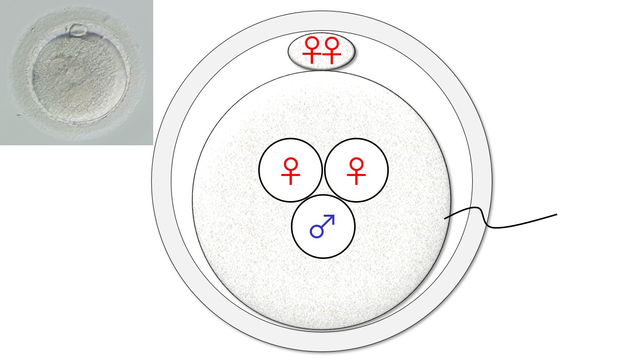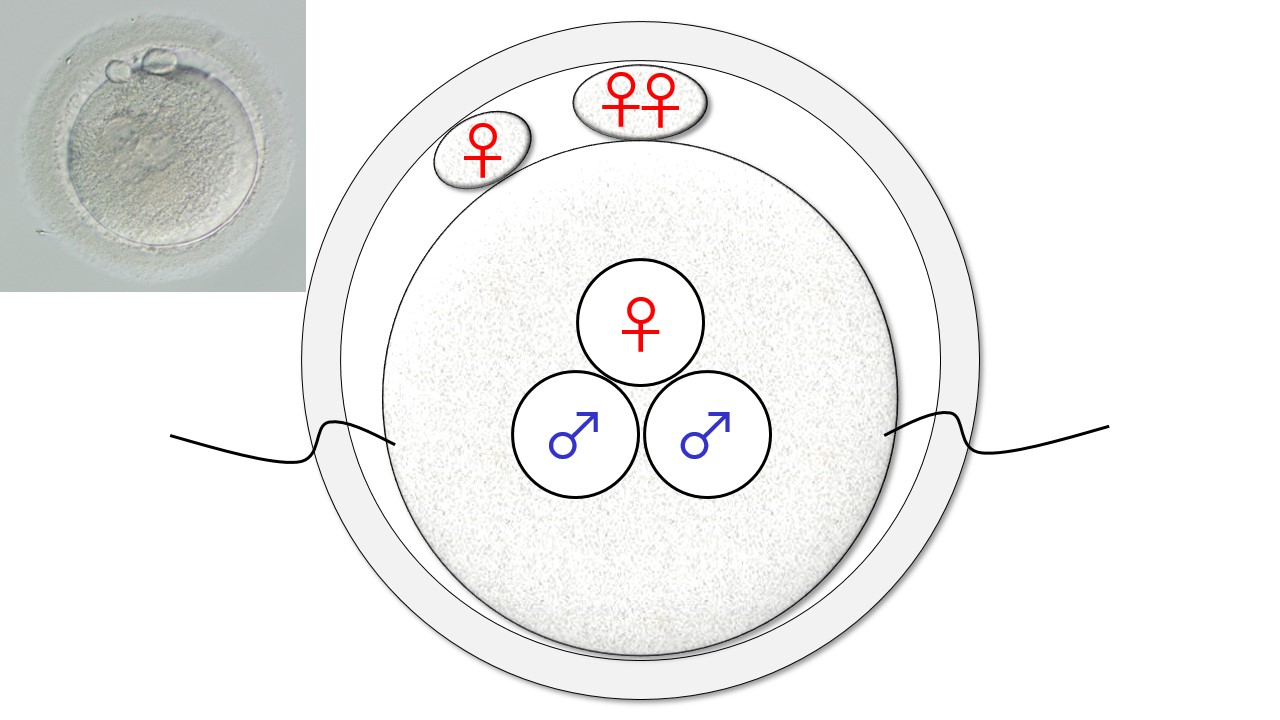 異常受精となった場合(卵子の中に3個の袋が見える)、卵子の外に出ているポチの数を数えれば卵子の中に見える♀と♂の個数が特定できます。卵子の外にあるポチが2個(上段)なら「♀♂♂」、ポチが1個(下段)なら「♀♀♂」の組合せになります。