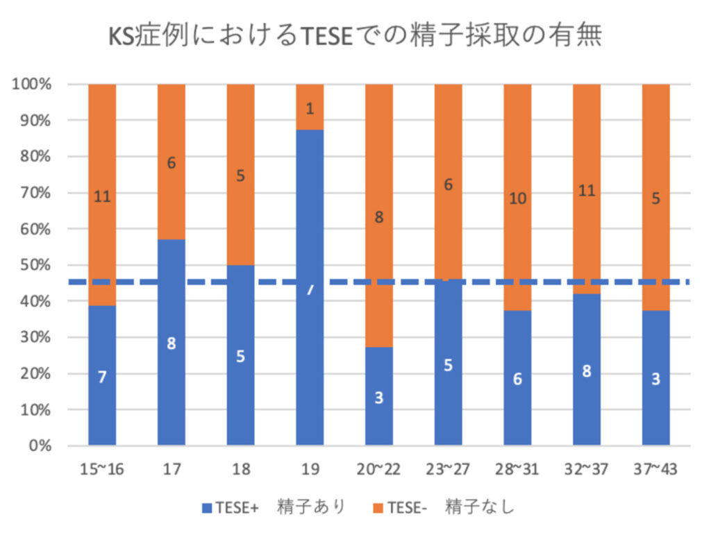 クラインフェルター症候群におけるTESEでの精子採取率は、加齢とともに低下する?