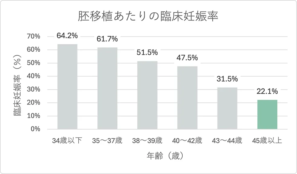45歳以降の妊娠率(自己卵)は非常に低く、体外受精においても臨床妊娠に至る確率は数%程度です。