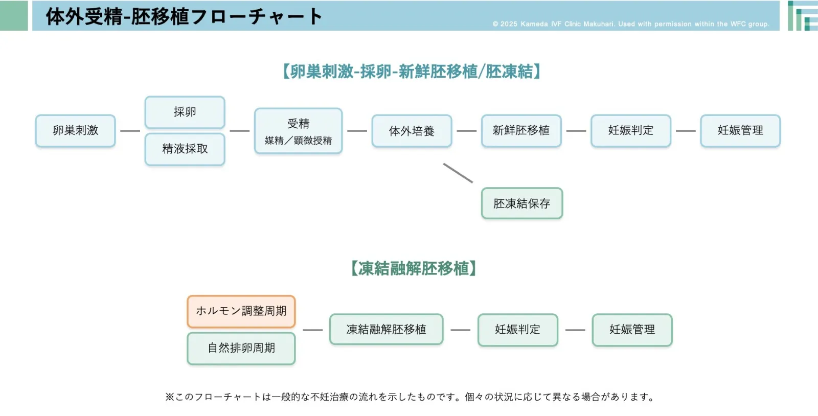 採卵と別の周期に自身の排卵を用いるか、ホルモン調整を用いて内膜調整を行った上で凍結胚を融解して胚移植を行います。排卵、もしくは黄体ホルモン補充後12〜16日目に妊娠判定を採血で行います。