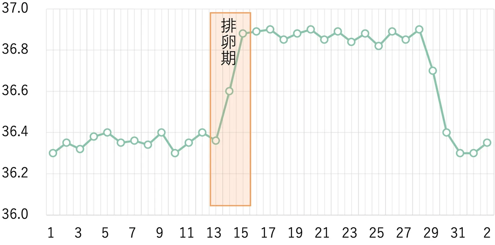 基礎体温表では、低温相から高温相に移る前後が排卵期にあたります。