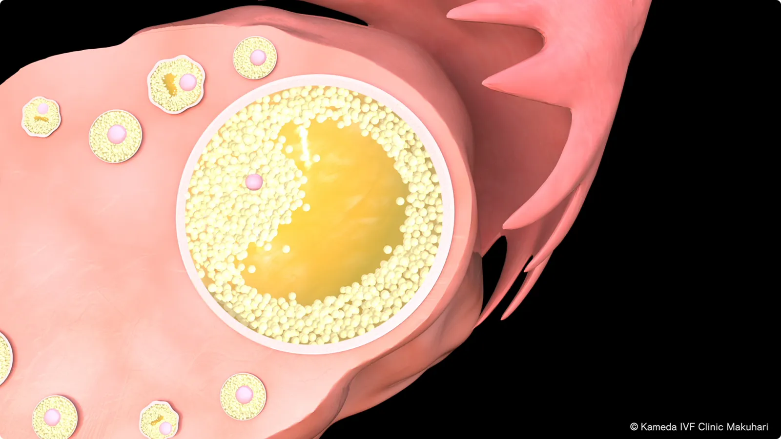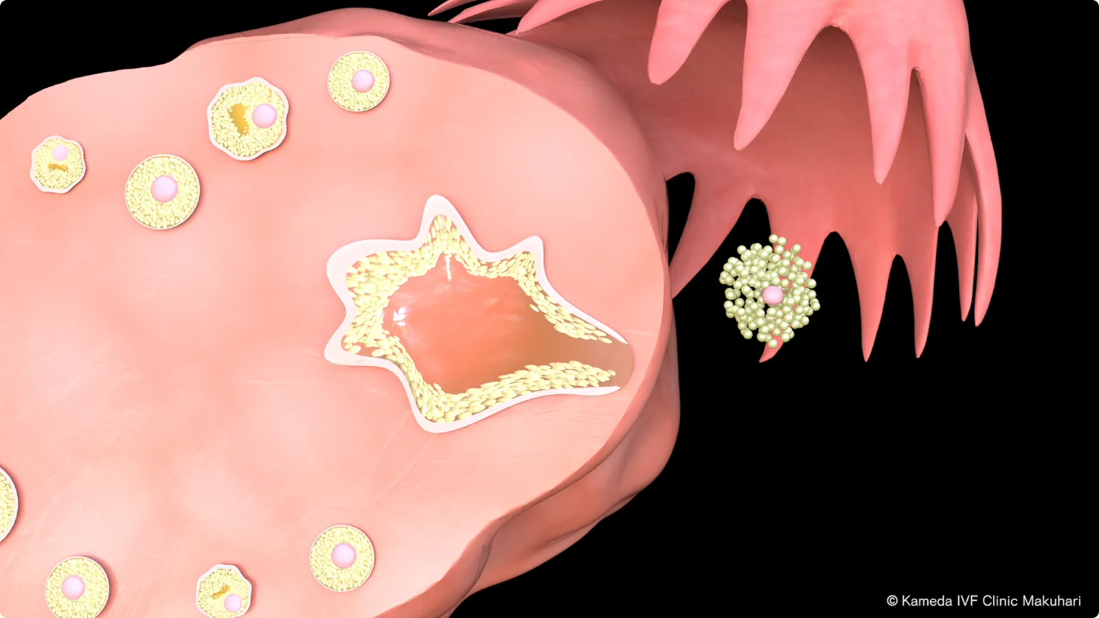 大きさが20mm前後になると排卵が起こり、卵巣から飛び出した卵子は卵管に取り込まれます(ピックアップ)。