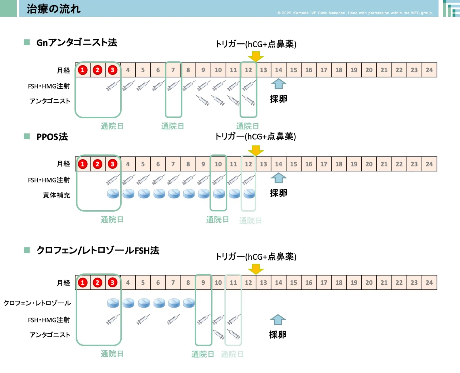 - 採卵2日前にhCG注射またはGnRHアゴニスト点鼻で最終成熟を促進