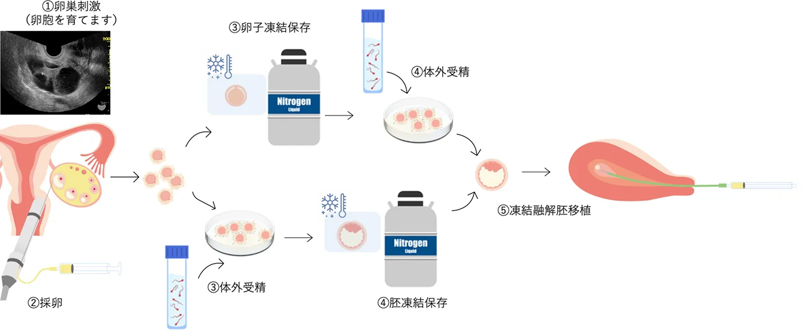 不妊治療として行われる体外受精では、回収した卵子をパートナーの精子と受精させ、少し成長させて胚移植(子宮内に戻す)できる状態の受精卵(胚)として凍結保存します。