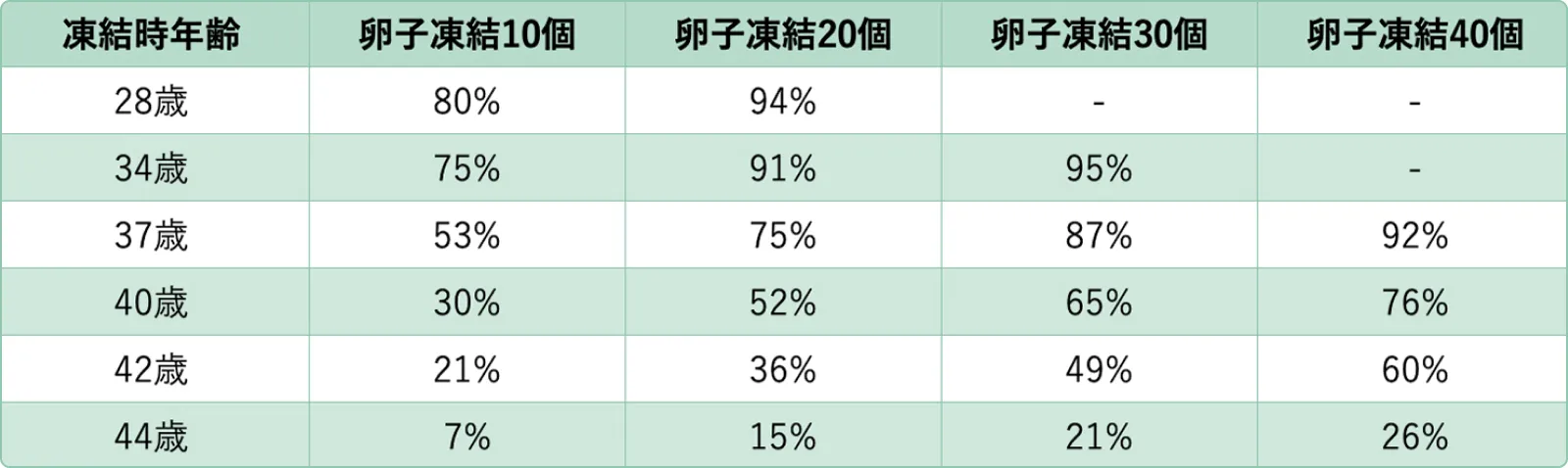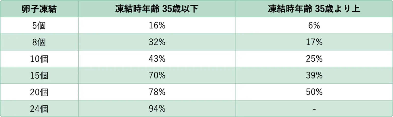 年齢が若い方が凍結した卵子数が少なくても妊娠できる可能性が高くなりますが、高齢になると20個以上の卵子を凍結しても一定以上妊娠率が上がらないと言われています。