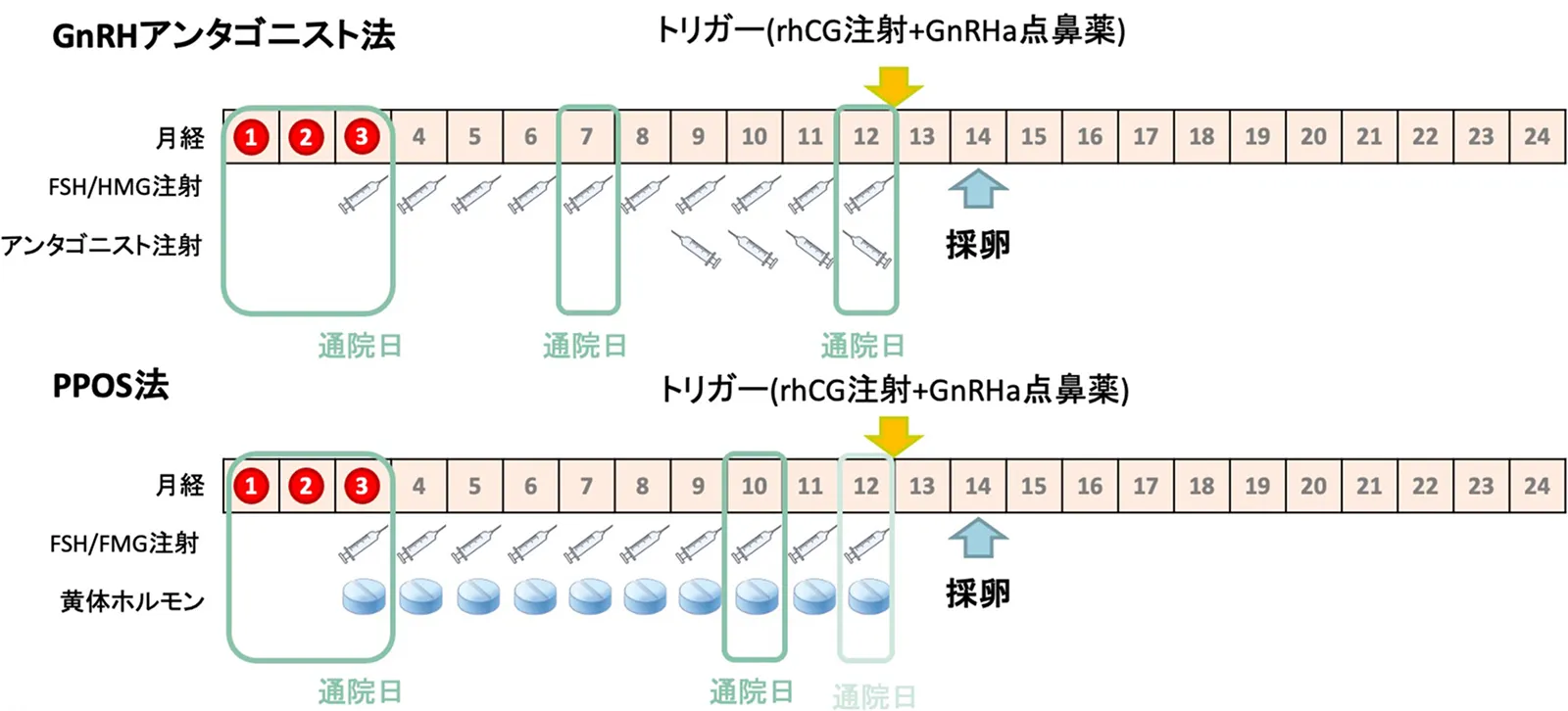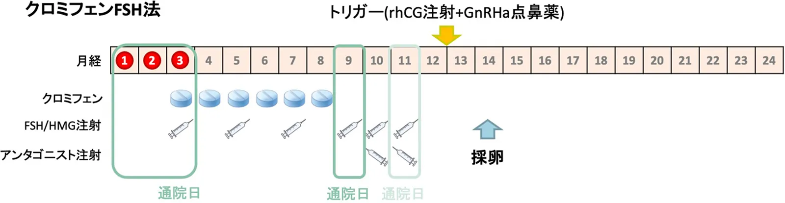 - 月経3日目以内に診察し、そこから10回程度の自己注射(来院でも可能)を行います。